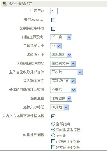 選擇欲調整的iMail進階設定項目,進行調整,調整完成後,選取〔確定〕按鈕。 |