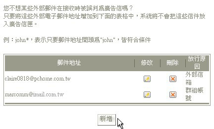 | 當您利用本系統收取外部郵件時,系統同時會檢查該封信件的收信人是否為目前系統的帳號,為了避免外部郵件、設定群組或設定自動轉寄郵件,被系統誤判而過濾至廣告信匣。建議您將外部郵件帳號、群組帳號或設定自動轉寄帳號加入合法收件人名單中,日後再收到相同來源的信件時就不會再被誤判而過濾到廣告信匣中了。 |
